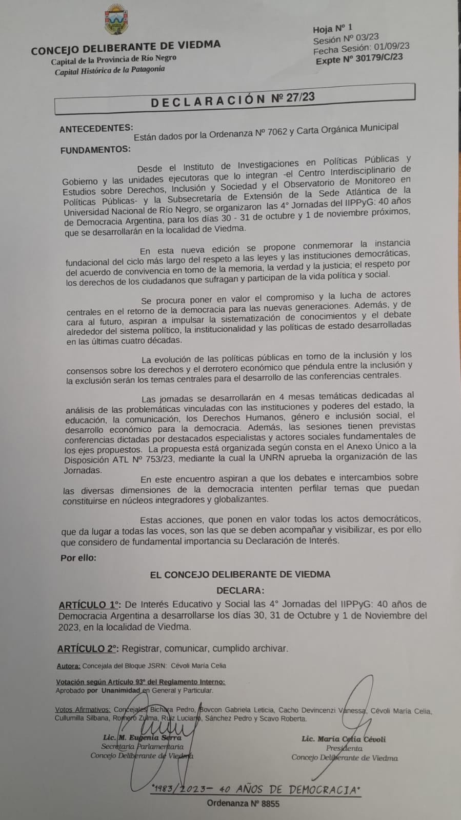 - Jornadas declaradas de "Interés Educativo y Social" por el Concejo Deliberante de Viedma, a través de la Ordenanza 8855/23.