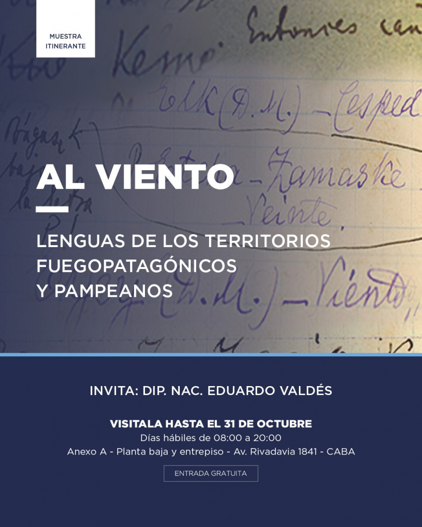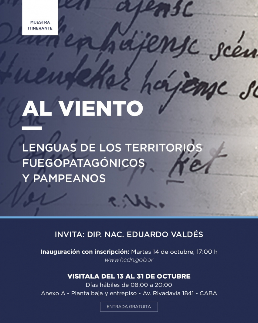 La Sede Andina de la Universidad Nacional de Río Negro invita a participar de la muestra documental Al viento. Lenguas de los territorios fuegopatagónicos y pampeanos, que se exhibirá del 13 al 31 de octubre en la planta baja y el entrepiso del edificio Anexo A de la Honorable Cámara de Diputados de la Nación (Av. Rivadavia 1841, CABA).