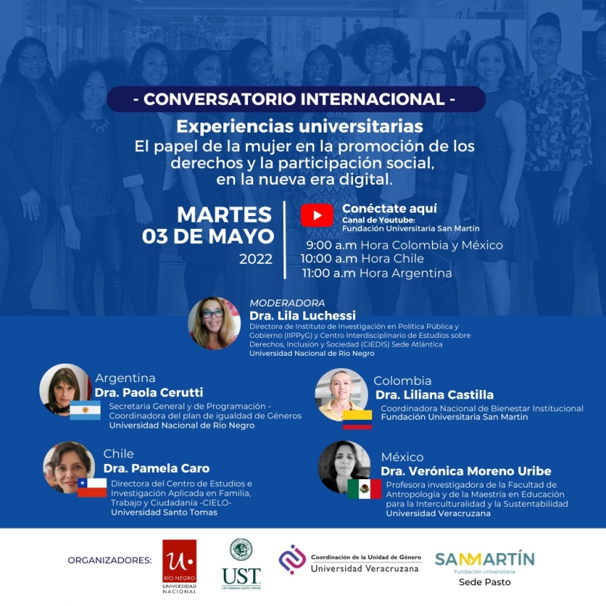 La Universidad Nacional de Río Negro (UNRN) organiza, junto a otras instituciones de educación superior latinoamericanas, el encuentro internacional virtual El papel de la mujer en la promoción de los derechos y la participación social en la nueva era digital. Experiencias universitarias que se realizará el próximo martes 3 de mayo a las 11.00 Argentina / 10.00 Chile / 9.00 México y Colombia.