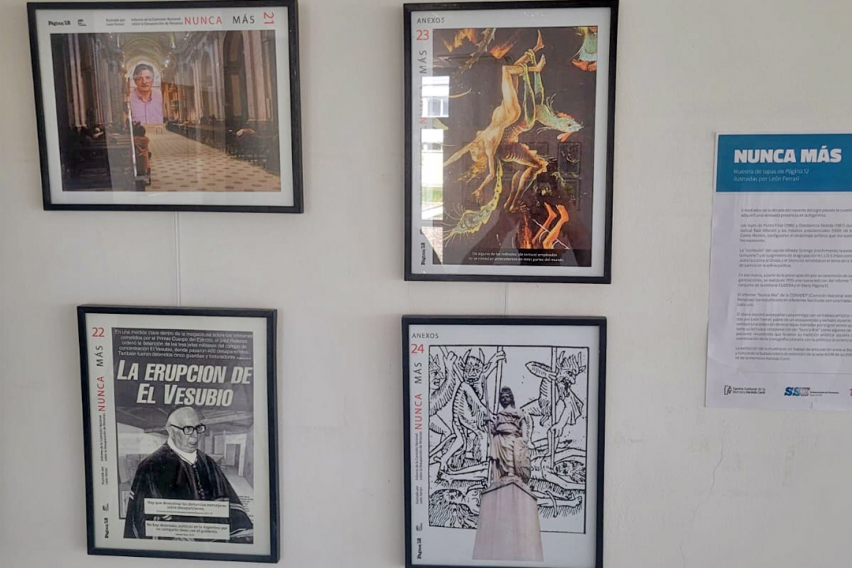 La muestra “Nunca Más”, pertenece al Centro Cultural de la Memoria Haroldo Conti, con ilustraciones del artista León Ferrari; en el marco de los 30 años de la publicación del Informe Nunca Más de la Comisión Nacional sobre la Desaparición de Personas (CONADEP). Se exhibe una selección de las ilustraciones de tapa realizadas por el artista a los fascículos del Informe de 1984, reeditados por el diario Página 12 y la editorial EUDEBA en 1995.