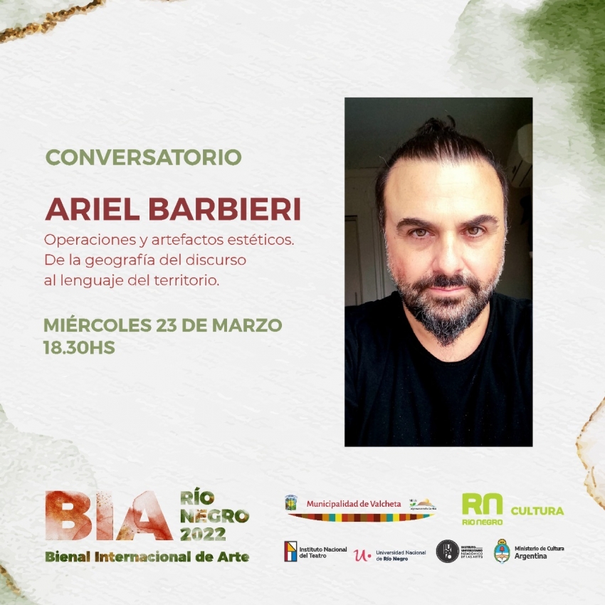 En el marco de la primera Bienal Internacional de Arte de Río Negro, que se realiza desde el 18 al 27 de marzo con el apoyo y la participación de la Universidad Nacional de Río Negro (UNRN), el director de la Licenciatura en Comunicación Social de la UNRN Sede Atlántica, Ariel Barbieri dará este miércoles 23 a las 18.30 de manera presencial en el Centro Cultural Libanés y a través de Zoom una charla abierta denominada Operaciones y artefactos estéticos. De la geografía del discurso al lenguaje del territorio.