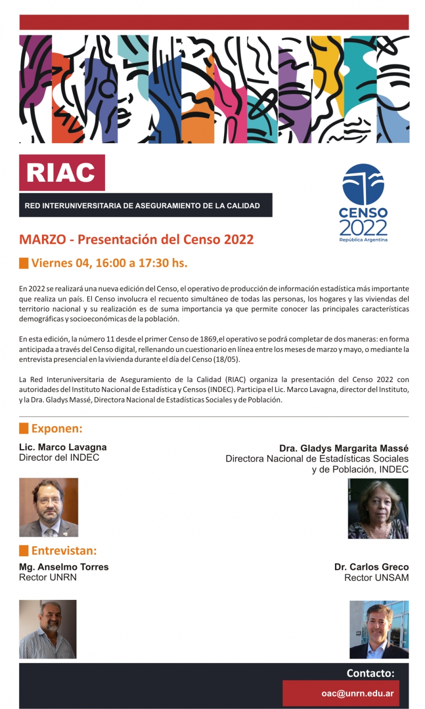 La Red Universitaria de Aseguramiento de la Calidad (RIAC) junto al Instituto Nacional de Estadística y Censos organiza esta presentación con las disertaciones de Marco Lavagna y de Gladys Massé, autoridades del INDEC.