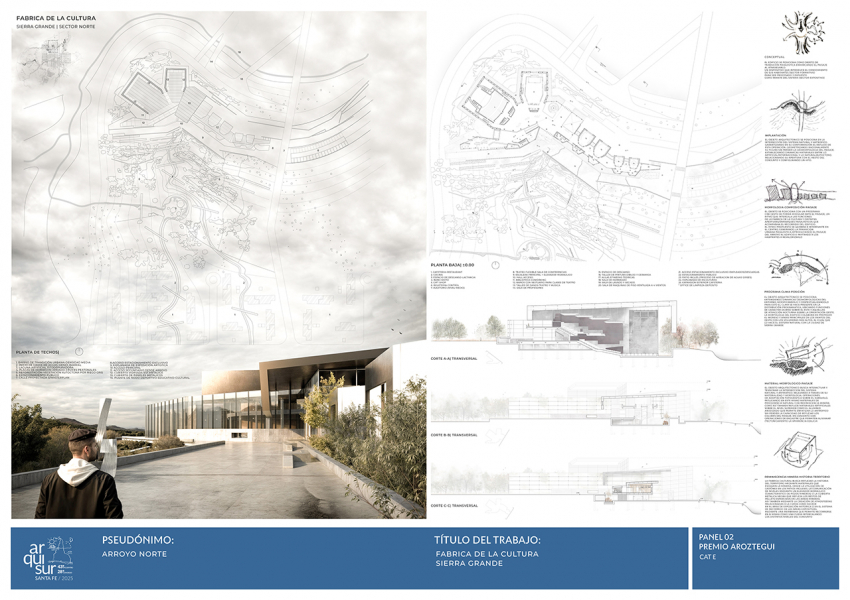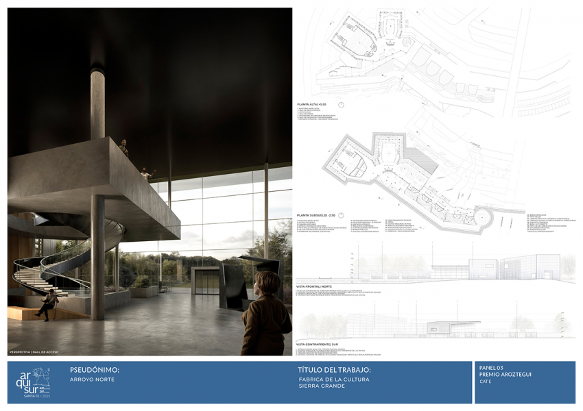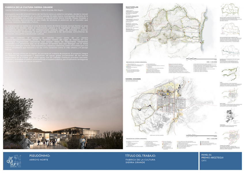 Nazareno Pennesi, estudiante de la carrera de Arquitectura de la Universidad Nacional de Río Negro (UNRN) Sede Alto Valle – Valle Medio, resultó finalista en la Categoría E del Premio Aróztegui para estudiantes de Arquisur, con su trabajo del Taller 5 titulado Fábrica de la Cultura - Sierra Grande, una propuesta de un centro cultural formativo y expositivo en la localidad ubicada en el sur del territorio rionegrino.