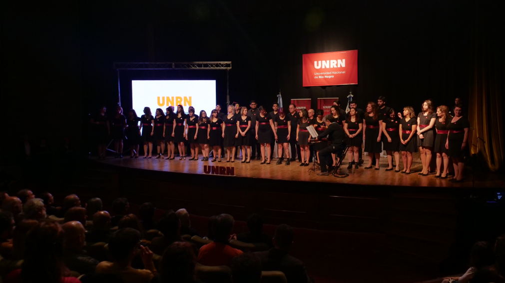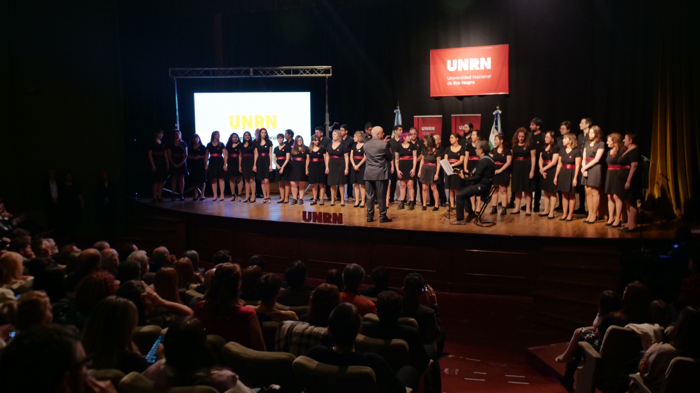 Como antesala a la toma de juramentos y el discurso del rector los integrantes del Coro de la UNRN ofrecieron un repertorio para engalanar la ceremonia que reunió a gran cantidad de asistentes.
