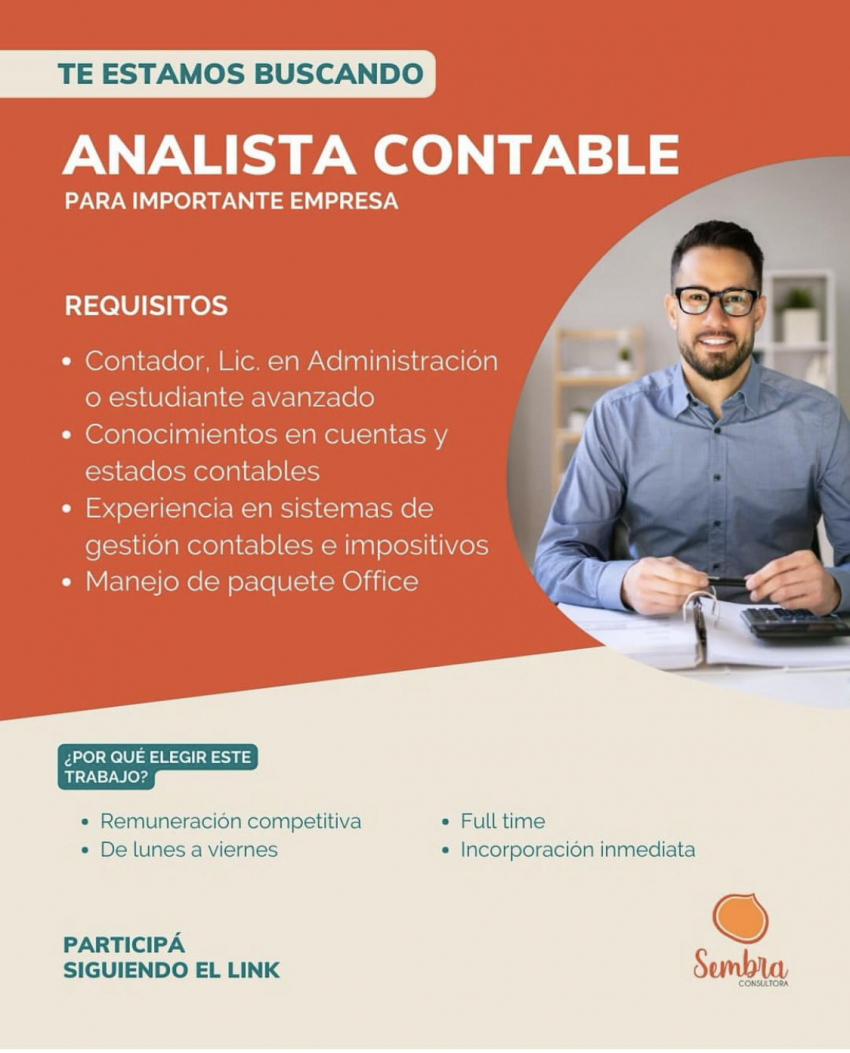 Serán requisitos para la postulación: ser estudiante o egresado/a de administración, contador o afines (excluyente); contar con experiencia previa y conocimientos en registración contable, pagos y cobros; y tener buen manejo de excel y sistemas de gestión.