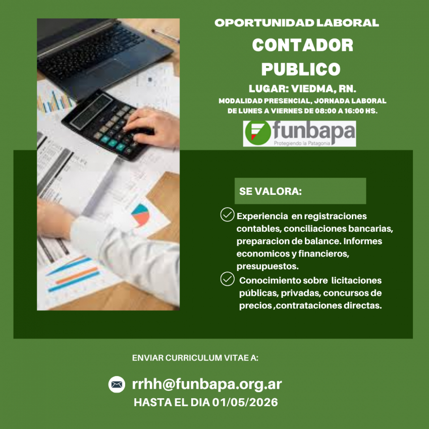 La Dirección de Desarrollo Estudiantil, en el marco del Programa de Vinculación Laboral, informa que la empresa FUNBAPA (Fundación Barrera Zoofitosanitaria Patagónica) lanzó una convocatoria laboral en búsqueda de graduados/as de la carrera de Contador Público que la UNRN dicta en la Sede Atlántica, en Viedma.