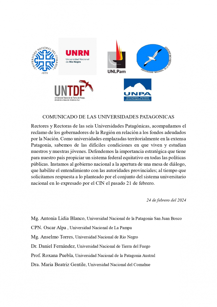El documento -emitido este sábado 24 de febrero- lleva la firma de los seis rectores de las Universidades Nacionales de la Patagonia: